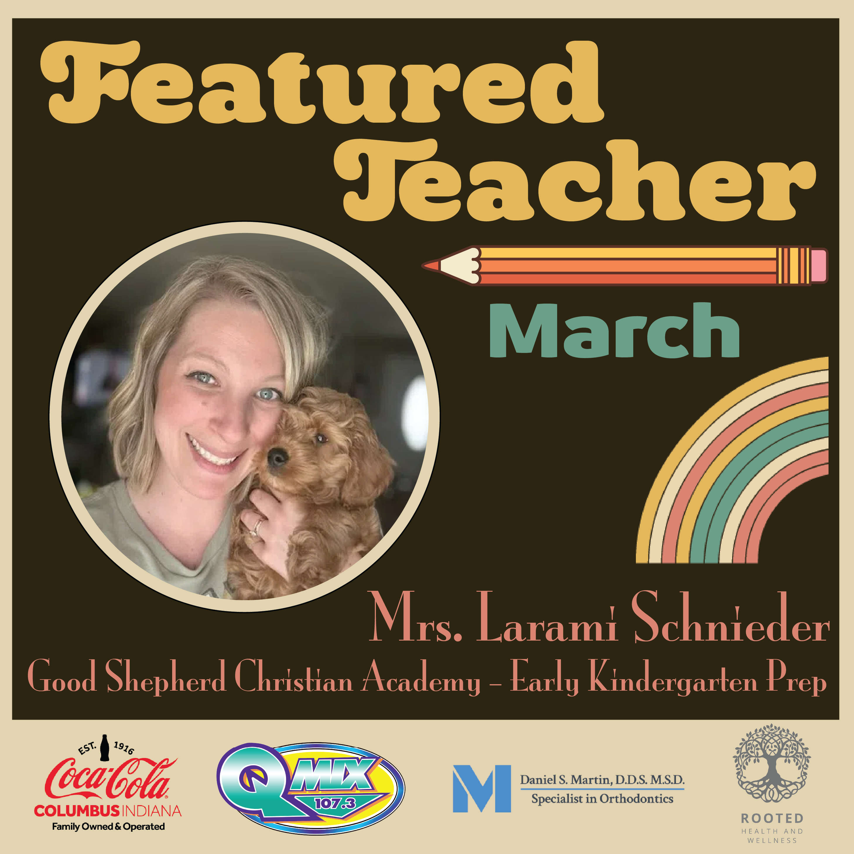 "Mrs. Larami Schneider doesn't just teach her students; she makes every lesson an experience. Her classroom theme is 'Under the Sea' and she makes sure the children feel every bit of that energy and fun while learning! Her level of care and concern for her students is unmatched! She wants to encourage reading, singing, and creativity every time her classroom meets. Fueled with coffee and a love for Jesus, that is why Mrs. Larami Schneider is amazing and an inspiration to us all!"